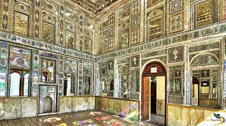 Dans chaque pièce, les plafonds sont extraordinaires et reproduisent les tapis qui recouvraient le sol (qui ont, hélas, disparus). Comme souvent à Shiraz,on trouve des vitraux qui ont un role décoratif et qui éloignent les mouches et moustiques.