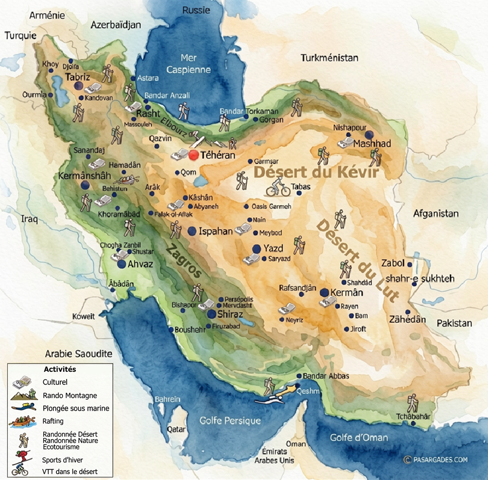 Ski dans les stations près de Téhéran (Dizin, Tochal), soleil et mer sur les îles de Kish et Qeshm : plongée, mangroves, marchés.