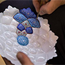 Principalement à Ispahan | ![]() | Mina kari L’émaillage ou "Minakari", une technique créative utilisée par la fusion de minéraux pour colorer et décorer des surfaces métalliques (or, argent et cuivre) avec les motifs raffinés traditionnels représentés sur un fond floral en bleu clair, vert, jaune ou rouge. |
