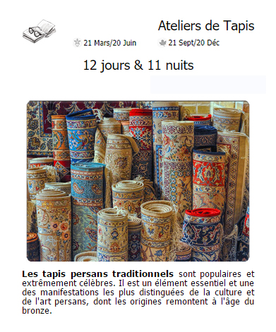 Le tapis persan est un élément essentiel et une des manifestations les plus distinguées de la culture et de l'art persans, dont les origines remontent à l'âge du bronze. Le luxe auquel est associé le tapis persan fournit un contraste saisissant avec ses débuts modestes parmi les tribus nomades de Perse. Le tapis était alors l'article nécessaire contre les hivers rudes. Depuis, il est devenu un mode d'expression artistique par la liberté qu'autorise notamment le choix des couleurs vives et des motifs employés. Les secrets de fabrication sont transmis de génération en génération. Les artisans utilisaient les insectes, les plantes, les racines, les écorces et d'autres matières comme source d’inspiration.