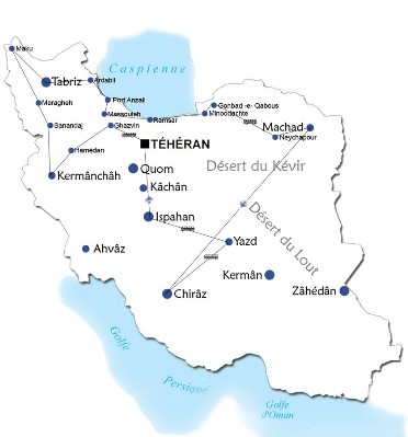 1.- Téhéran 2.- Hamadan 3.- Kermânshâh 4.- Sanandaj 5.- Marâgheh 6.- Tabriz 7.- Ardabil 8.- Bandar Anzali 9.- Râmsar 10.- Minoodasht 11.- Machhad 12.- Shiraz 13.- Yazd 14.- Ispahan 15.- Kashan | |||||||||