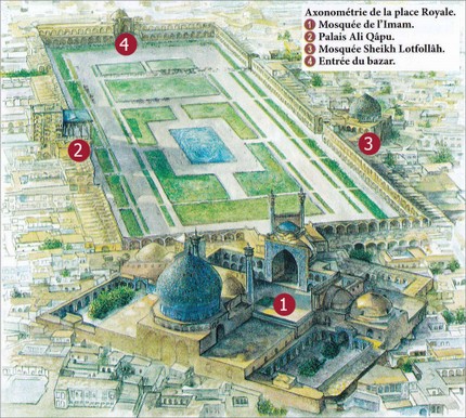 ![]() | La place Naghsh-e Jahan, aussi connue sous le nom de Meidān-e Emām (place de l'Imam), dans le centre historique de la ville d'Ispahan, en Iran, est une des plus grandes places du monde. Elle constitue un témoignage de la vie sociale et culturelle de la Perse pendant la dynastie des Séfévides et a été inscrite au Patrimoine mondial de l'UNESCO en 1979 comme site historique important. Selon un agencement typique de l'architecture iranienne (un espace rectangulaire à ciel ouvert bordé de quatre iwans), ses quatre côtés sont bordés par quatre édifices :