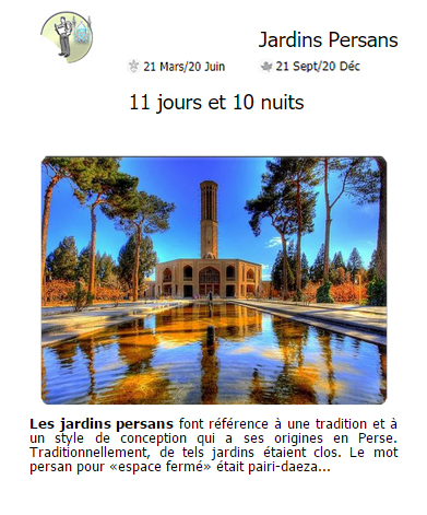 Ce n'est qu'avec les traces de jardins persans royaux de Pasargades, première capitale historique de l'Empire perse, et de Persépolis que se dessina le tchaharbagh, "les quatre jardins", le jardin persan, divisé en quatre parties par un plan en croix. Il va se propager dans tout le monde islamique, puis une forme spécifique de chahar-bagh va apparaitre dans le monde musulman, consistant à faire jouxter deux tchaharbagh offrant ainsi deux croix, soit huit parties correspondant aux huit portes du paradis, l'ensemble étant traversé par quatre canaux représentant les quatre fleuves du paradis ; une fontaine trône souvent au croisement central.