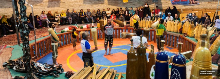 Leur utilisation est décrite dans les paragraphes qui suivent. Exercices particuliers Le Varzesh-e Pahlavani est très codifié et les exercices pratiqués par les pahlevans suivent un ordre établi, sous la direction du morshed. Les différents exercices pratiqués dans la zurkhaneh sont décrits dans les paragraphes qui suivent. Pā zadan (échauffement) Au début d'une séance d'entraînement et au cours de celle-ci, les pahlevans font des mouvements de pied et de bras, consistant en de petits sauts sur place et des mouvements circulaires des bras. Ces mouvements sont pratiqués à la fois en tant qu'échauffement ou d'étirement en fin de séance ; mais ils ont aussi pour but d'améliorer la force des jambes et des bras, et de rendre meilleure les fonctions cardio-respiratoires. Sang gereftan (bouclier) Les pahlavans, après l'échauffement, commencent l'exercice appelé Sang gereftan. Le Sang consiste en deux pièces de bois dur de forme rectangulaire (ressemblant à un bouclier) pesant entre 20 et 40 kilos (en fonction de l'âge du pratiquant). Chaque pièce de bois mesure 70–80 cm de large pour 100–110 cm de long. Une poignée est fixée au milieu de chaque sang. L'exercice consiste, pour les pahlevans allongés sur le dos et se déplaçant de droite à gauche, à lever puis descendre le sang, une main après l'autre. Le sang ne doit jamais toucher le sol. Dans les tournois pour jeunes et adultes, le nombre de mouvements peut atteindre 72 en 7 minutes, les pahlevans les plus forts arrivant à atteindre 115 mouvements. Le but du sang gereftan est de développer les deltoïdes, les pectoraux, les triceps, les trapèzes et les muscles du cou et de l'abdomen. Cet exercice n'est pas accompagné par les percussions, le Morshed chante alors des poèmes épiques pour encourager les pahlevans. Shena raftan (pompes) Après les exercices de Sang Gereftan et Pā Zadan, les lutteurs commencent un exercice de pompes. Ils forment alors un cercle dans le puits de la zurkhaneh, dos au mur et jambes bien écartées. Ils se penchent ensuite vers l'avant et font reposer leur poids sur la barre prévue à cette intention. Cette barre mesure entre 50 et 70 cm de long pour 10 cm d'épaisseur et est supportée par deux pieds courts. Les mouvements de descente et de remontée sur les bras sont exercés dans différentes formes et sont accompagnés des percussions et du chant du Morshed. Le pahlavan le plus vieux commence cet exercice au centre du cercle alors que le meneur du groupe conduit les mouvements de "pompes" du groupe. Les objectifs de cet exercice sont de renforcer les triceps, les pectoraux, les muscles des épaules et du cou, les quadriceps et les abdominaux. L'exercice se termine par un autre exercice de Pā Zadan. Mīl gereftan (Masse) La masse utilisée pour cet exercice est faite de bois et a une poignée d'un côté alors que l'autre côté est alourdi. Le poids de l'instrument peut varier de 2 à 50 kg. Cet exercice vient à la suite des précédents. À l'origine, il a été pensé pour entraîner les hommes à porter et à manipuler des masses d'armes en temps de guerre. Chaque Pahlevan porte deux masses, une dans chaque main, et pose la partie alourdie sur ses épaules. Au signal du Morshed et en suivant le rythme des percussions, il les fait tourner autour de ces épaules. Les lutteurs les plus habiles font parfois des exercices plus spectaculaires, en agissant comme s'ils jonglaient avec les masses. Cet exercice est destiné à renforcer les épaules, les triceps, les biceps, les pectoraux et les trapèzes. Charkh zadan (toupie) Cet exercice est un mouvement particulier des exercices faits dans la zurkhaneh et consiste à tourner sur soi même à la façon des derviches tourneurs au cours de leur danse appelée Samâ. Au début de cet exercice, les pahlevans se disposent en cercle autour du puits, dos tourné au mur. C'est le plus jeune lutteur qui commence par se mettre au centre du cercle et à tourner, au début doucement, puis de plus en plus vite. Après lui, l'exercice est répété par tous les lutteurs qui viennent se mettre au centre du cercle et font la toupie à leur tour, par ordre d'âge. Le plus vieux pahlevan présent achève l'exercice, qui est continuellement accompagné de chants et du rythme des percussions. À la fin de son tour - qui peut durer jusqu'à 15 minutes sans perte de contrôle ou étourdissment, les lutteurs font face au Morshed, le saluent et laisse la place au suivant. Pendant qu'ils font la toupie, les pahlevans étendent leurs bras de chaque côté du corps à l'horizontale, à la hauteur des épaules. Chaque lutteur ayant son propre style, la toupie peut être faite uniquement au centre du cercle, ou au contraire se dérouler en différents endroits du cercle formé par les participants. Les objectifs de cet exercice sont d'améliorer la coordination neuro-musculaire et l'agilité. Kabbadeh zadan (arc) Le kabbadeh est un instrument en métal ayant la forme d'un arc, pesant entre 7 et 10 kg - parfois jusqu'à 16 kg durant les compétitions - mesurant entre 1 et 1,5 m de long. Au lieu de la corde est fixée une grosse chaîne, des disques de métal sont parfois accrochés à cette chaîne. L'exercice consiste à lever l'instrument au-dessus de sa tête, l'arc dans la main droite et la chaîne dans la gauche. Le Pahlevan commence par embrasser le kabbadeh puis tend son bras droit, l'avant bras gauche formant alors une ligne horizontale au-dessus de sa tête. L'exercice se poursuit ensuite par symétrie, au son des percussions, des chants du Morshed et des tintements de la chaîne en métal. L'objectif de cet exercice est de renforcer les muscles des épaules, les triceps et biceps, les trapèzes, les obliques Koshti gereftan (lutte) Parfois, après le Kabbadeh zadan, les Pahlevans s'entraînent aux techniques de "lutte héroïque" antique, qui est la partie la plus fondamentale de l'entraînement dans les zurkhaneh et est un exercice qui remont